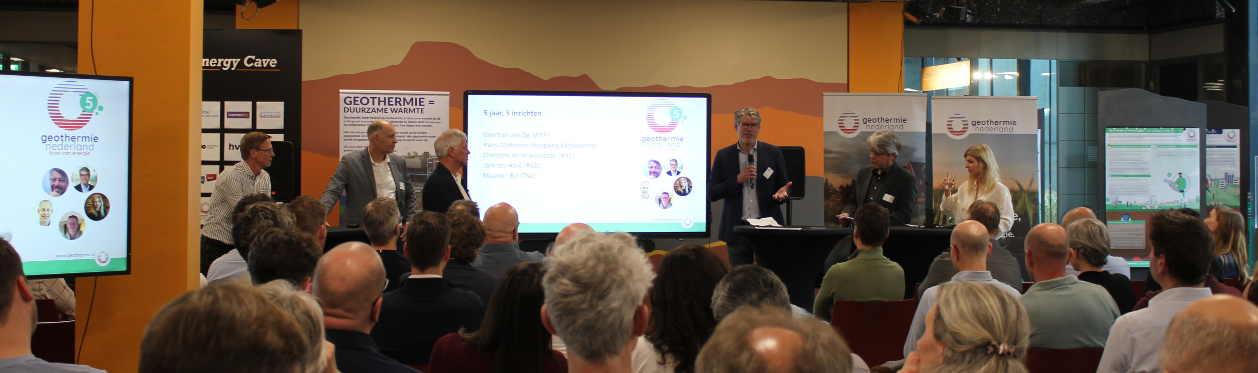 Daarna deelden vijf betrokkenen uit de sector – ieder vanuit een andere rol – hun belangrijkste inzicht of les uit de afgelopen vijf jaar: Hans Olsthoorn (Hoogweg Aardwarmte), Geertjan van Og (WEP), Maarten Bijl (TNO), Jorn ten Have (RVO) en Charlotte de Wijkerslooth (HVC).