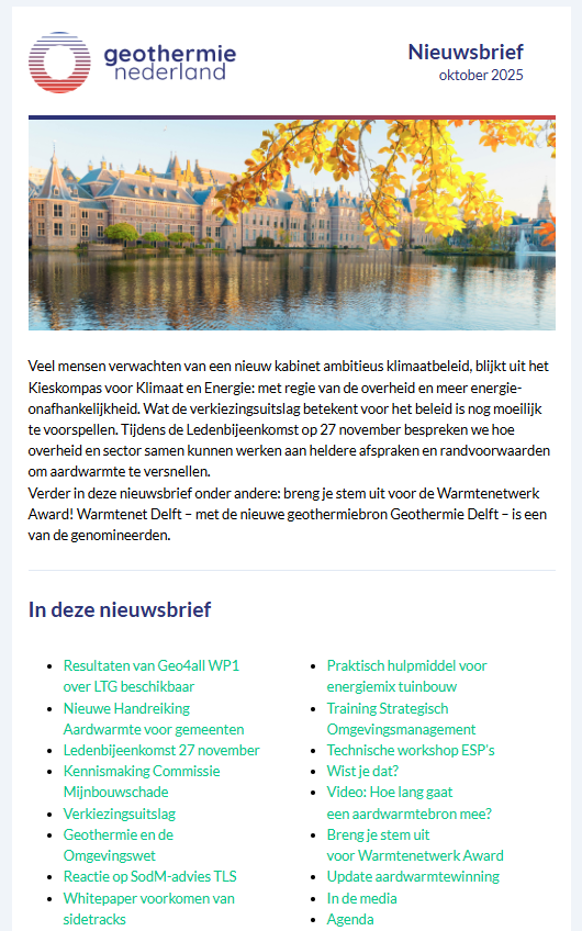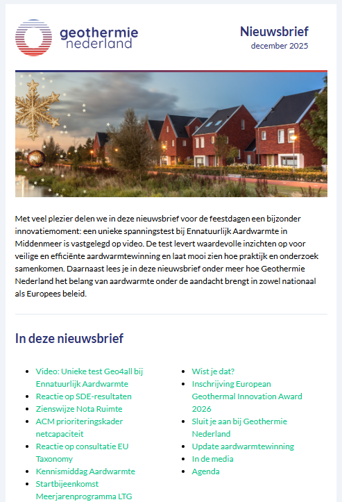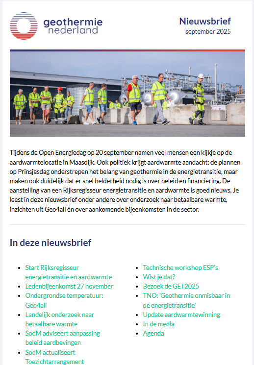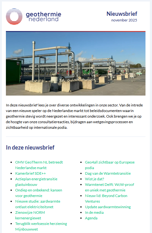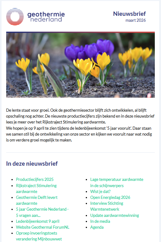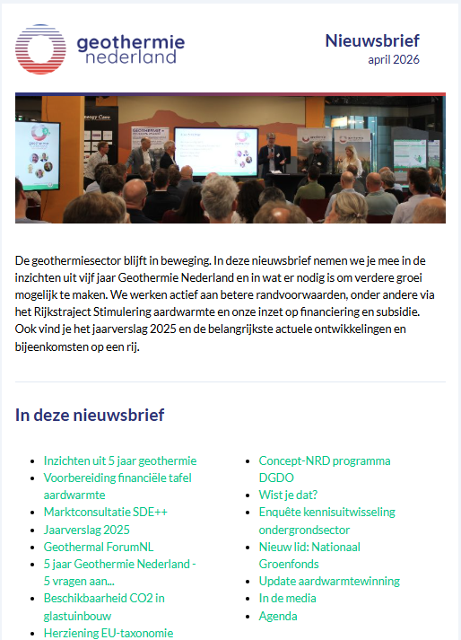 Elke maand verschijnt een digitale nieuwsbrief van Geothermie Nederland. Met deze nieuwsbrief informeren we over activiteiten en ontwikkelingen in de sector. Daarnaast ontvangen leden af en toe speciale ledenberichten met meer informatie over bepaalde onderwerpen.